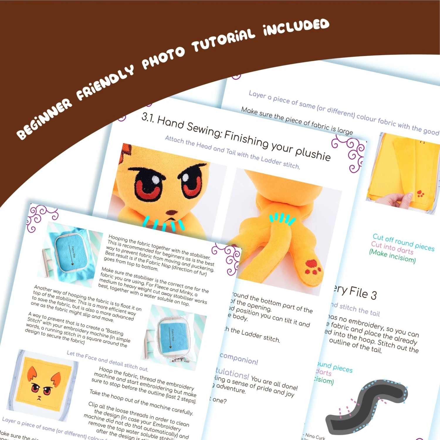 Includes a Step by Step Tutorial guide for embroidery and a Sewing tutorial for the Beak (as extra), all with pictures and Color Thread Guide.