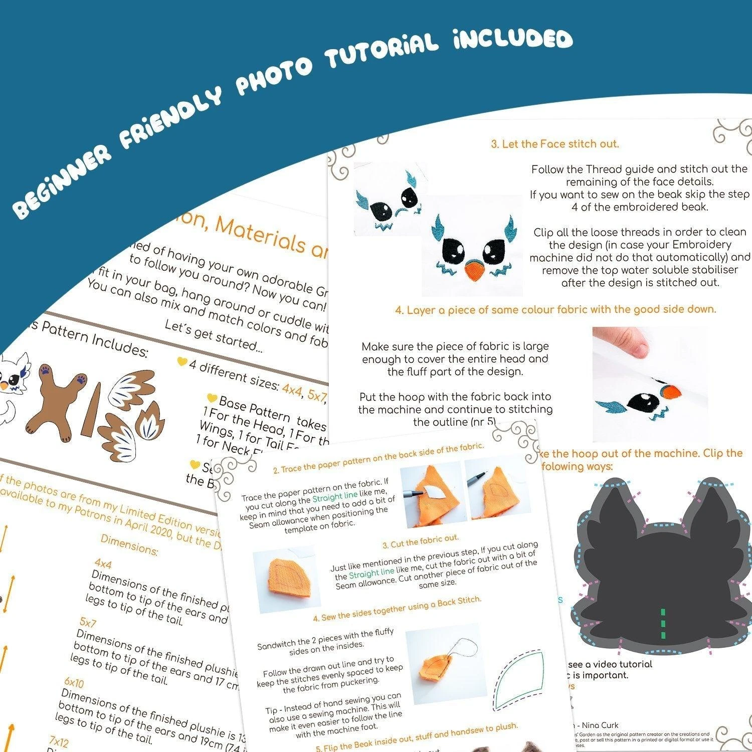 Includes a Step by Step Tutorial guide for embroidery and a Sewing tutorial for the Beak (as extra), all with pictures and Color Thread Guide.