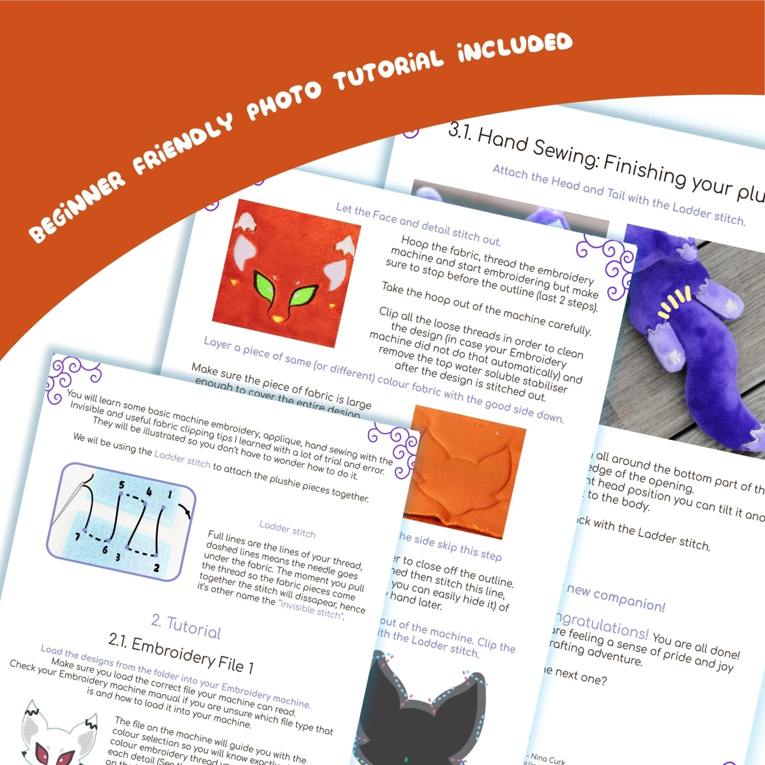 Elegant long tailed Kitsune spirit in the form of this beginner friendly in the hoop embroidery pattern.
