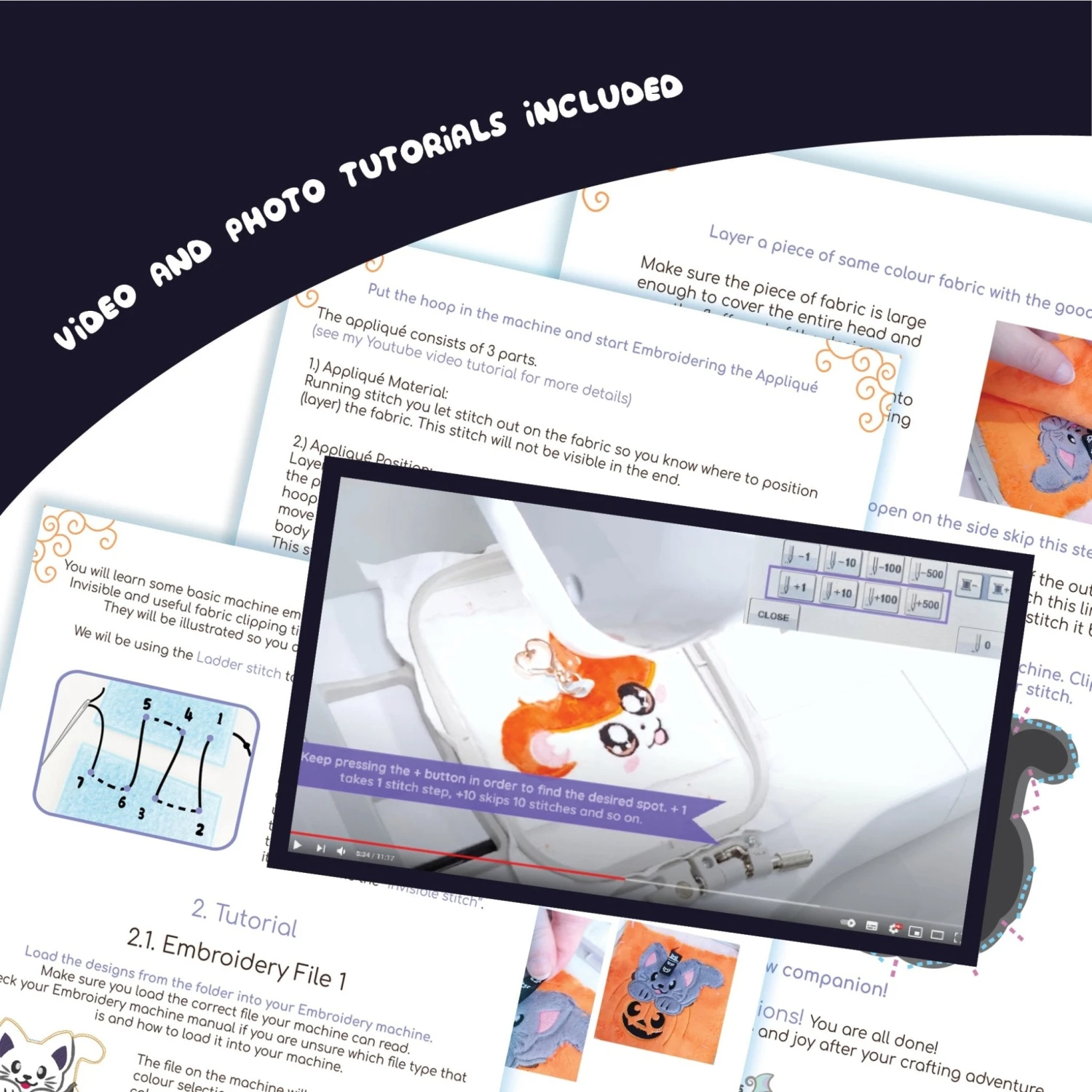 😻 Base Pattern takes 1 Hooping = which means you will need 2 pieces of fabric per hoop and a little extra for applique.