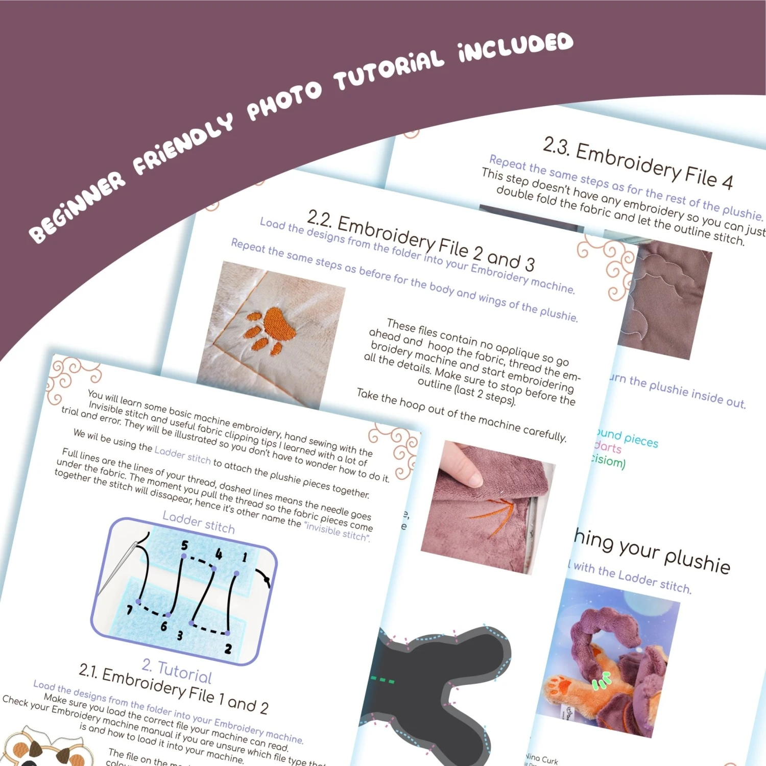 Includes a Step by Step Tutorial guide for embroidery and a Sewing tutorial for the Beak (as extra), all with pictures and Color Thread Guide.