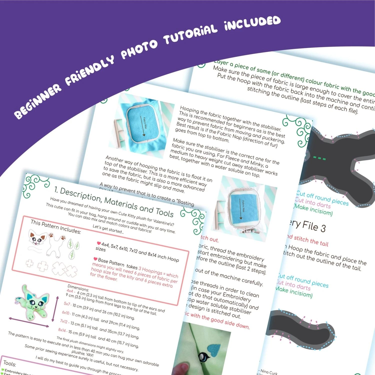 This Pattern takes 3 Hoopings only for the base. One For the Head and Tail & One For the Body. Rose needs an extra 3 Hoopings. This means you will need 6 pieces of fabric per hoop for the Kitty and 6 for the rose.