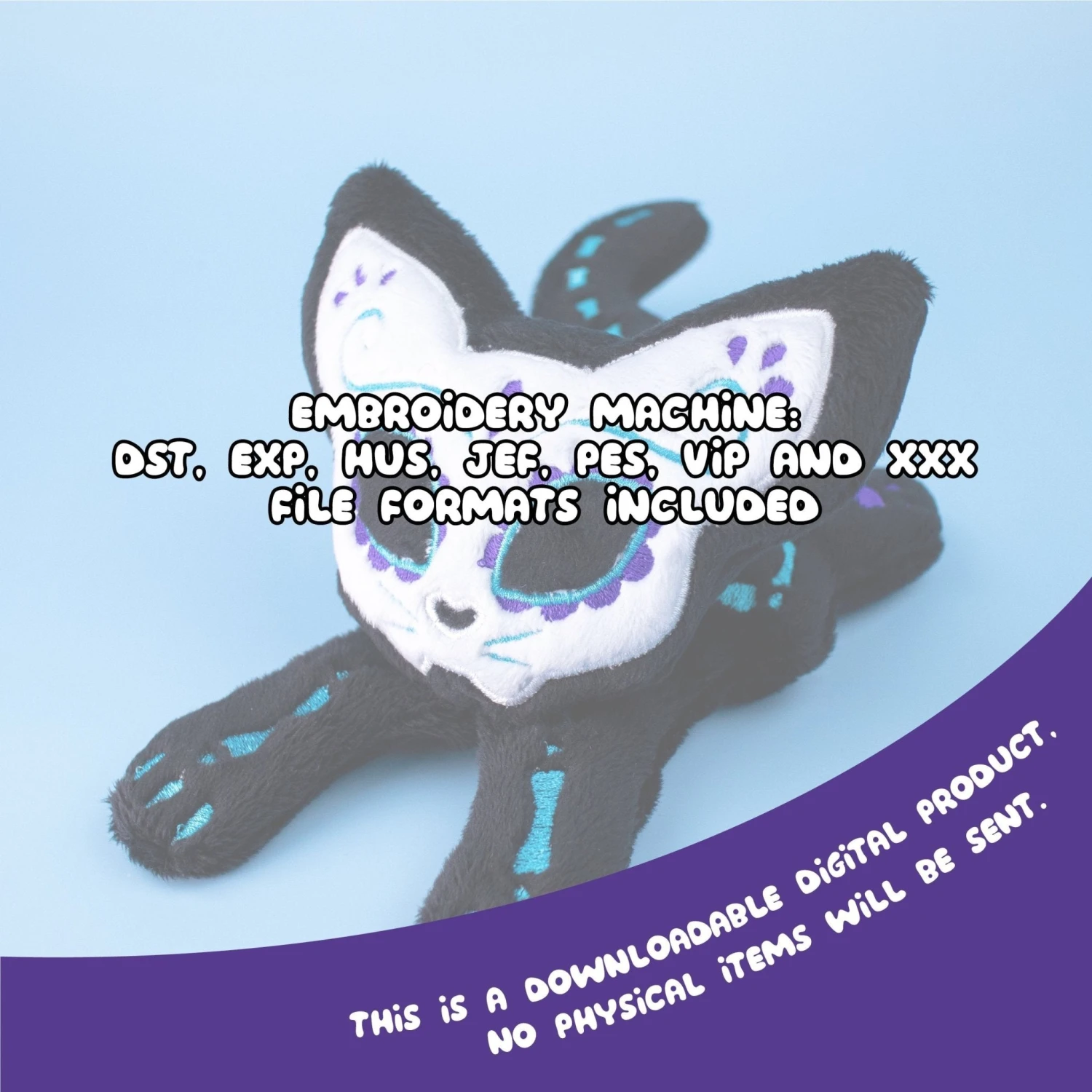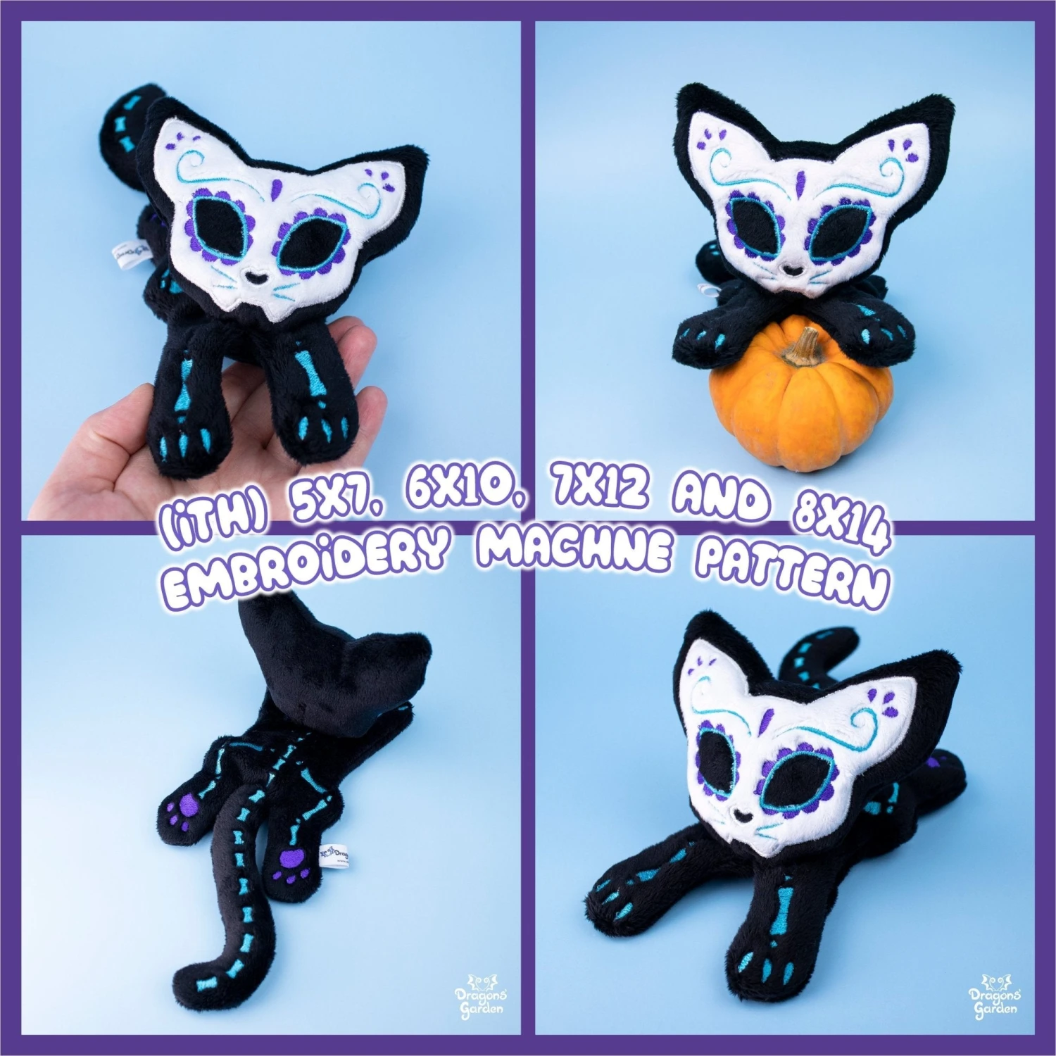Super Spooky but Sweet Sugar Skull Kitty In the Hoop Embroidery Machine Pattern. With multiple hoop sizes cat is the perfect Halloween Companion.