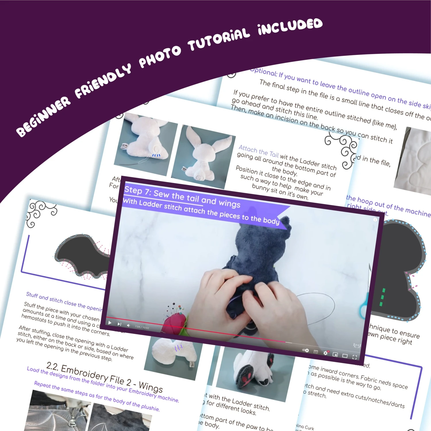 This pattern takes 5 hoopings and includes quite a lot of hand stitching in order to get more of a 3d version of the plushie. (60% Embroidery, 40% Hand stitching needed).