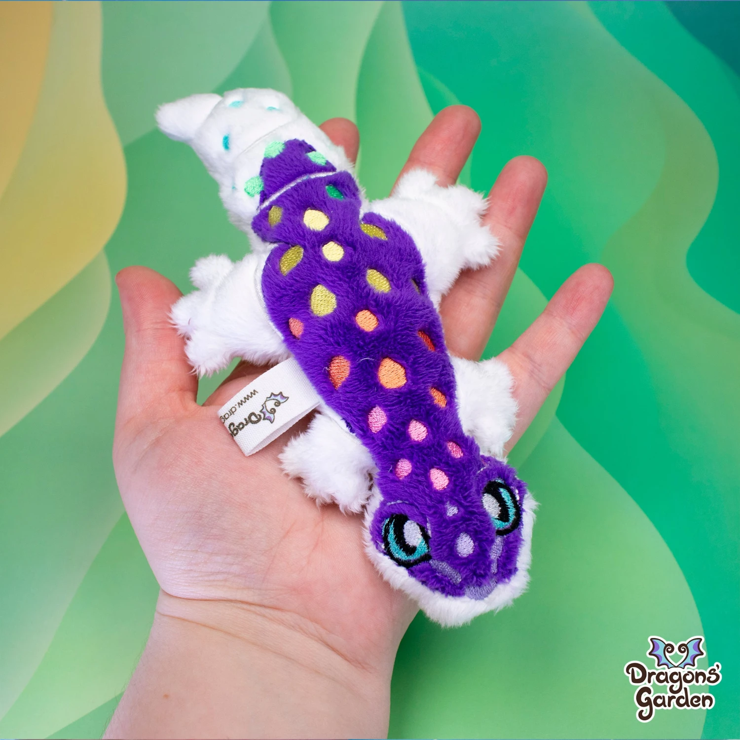 Lightly stuffed with about 55 grams of beans, these colorful little geckos are perfect to snuggle, squish, and take with you on all your adventures! Bright rainbow spots and soft white fluff make each one a vibrant and playful companion